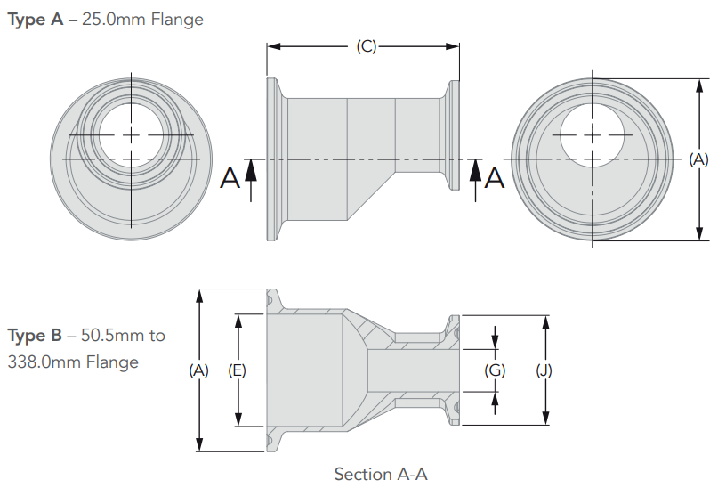 Eccentric Reducers Ferrule-ended, 1½” Nominal 1, ½” Nominal 2